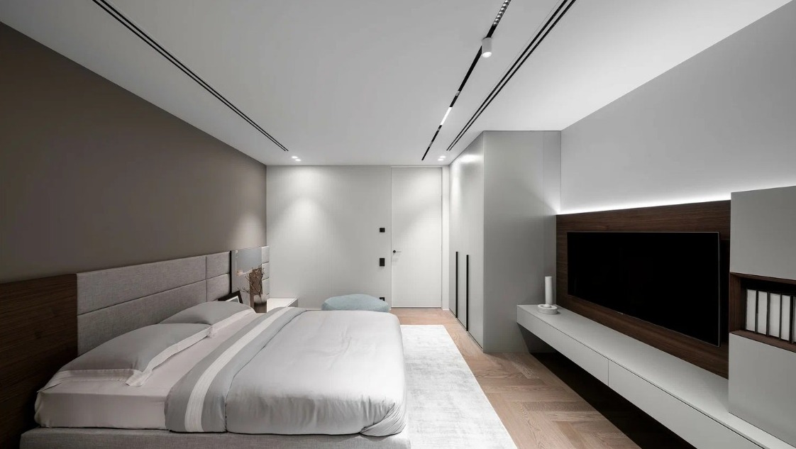 В спальне важно создать расслабляющую обстановку. Используйте мягкое освещение, точечные встроенные светильники и регулируемые настенные бра. Светодиодные ленты могут быть установлены вдоль кровати или вокруг зеркала, чтобы обеспечить мягкий свет, подходящий для чтения перед сном.