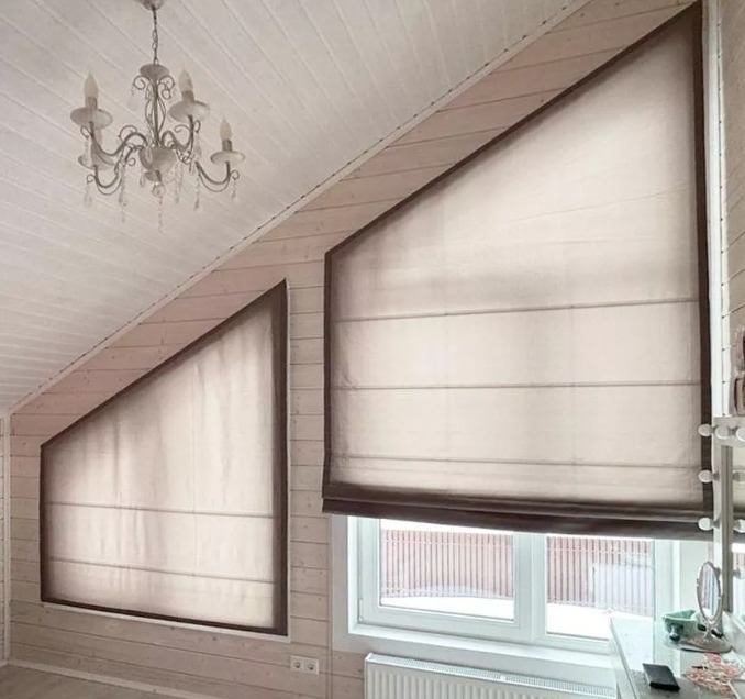 На скошенных окнах можно использовать различные системы крепления римских штор: